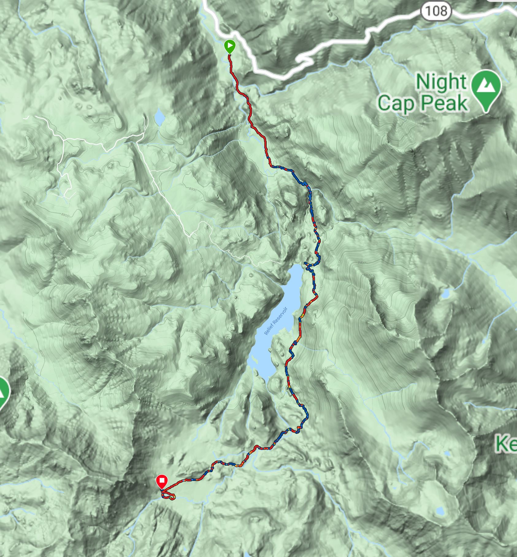The Relief Reservoir is long and beautiful, like a blue gem nestled between the gray granite peaks. Its shores are very steep and, although I could see possible ways down here and there, it would cost us much time to do so.