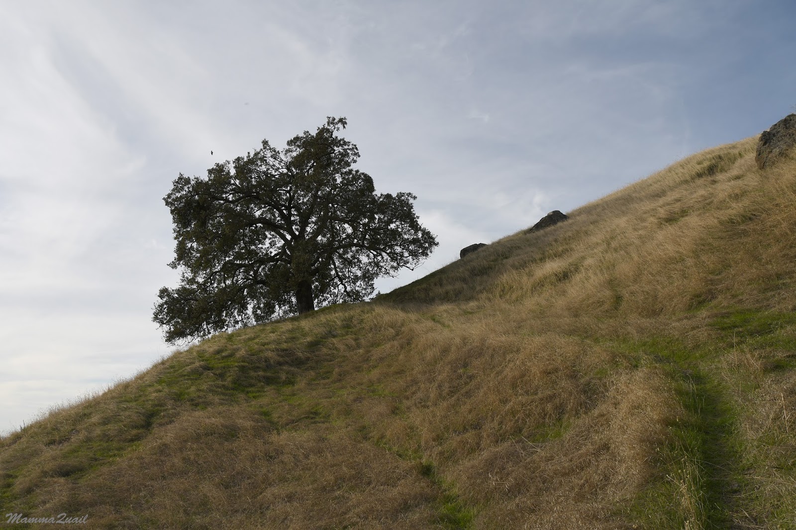 We were hiking in open grassland still, but there were more oaks along our path. Some stood alone and aloof.