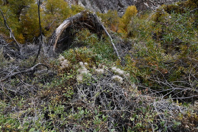 We didn't dwell on the ruins. I snapped a couple of shots of the structure and of the blooming plant which I thought was an Ericameria bush next to it, and we moved on - back down to the creek and to bushwhacking.