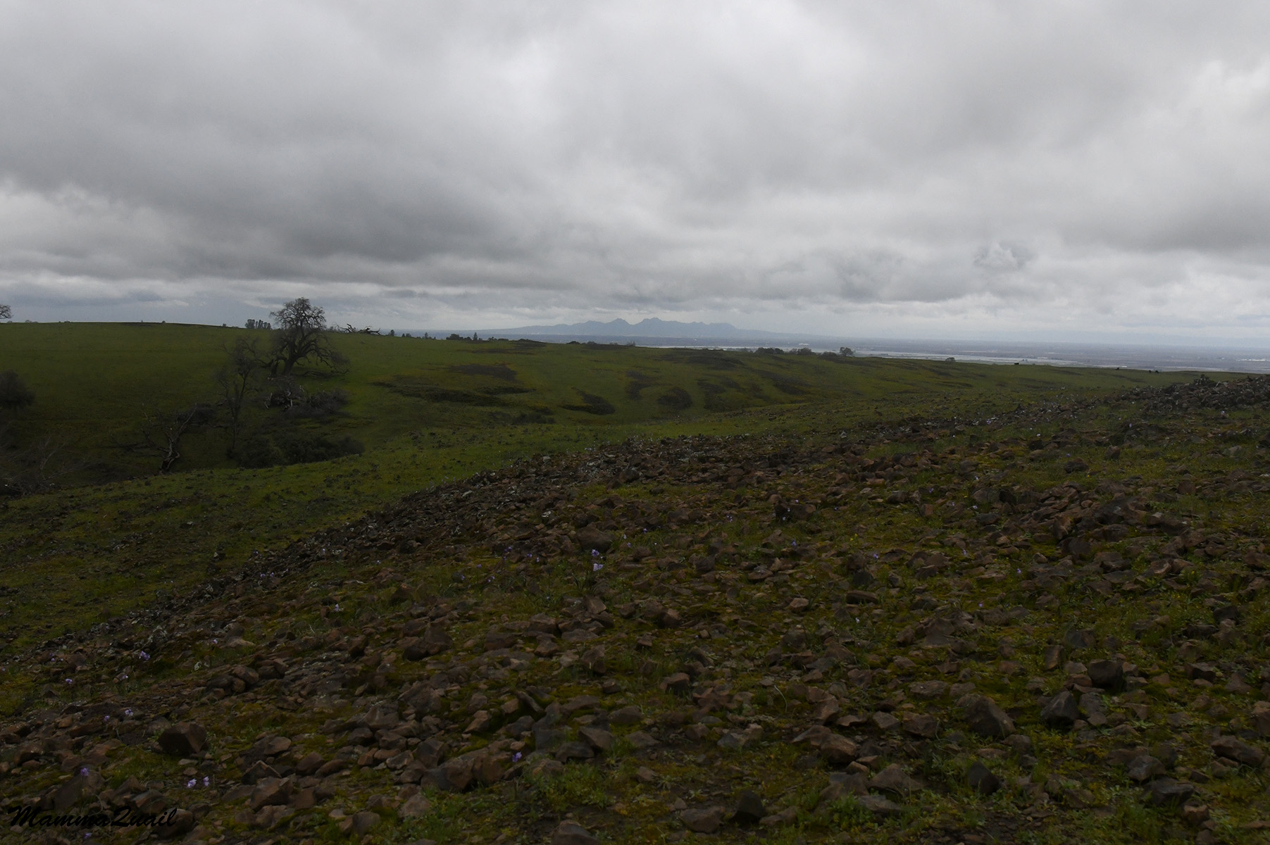 It didn't help that the drizzle resumed at that point. I tucked my camera under the poncho, pulling it out for quick shot when I wanted. The sky was dark and the clouds hung very low. In the thin gap between the clouds and the earth I detected a familiar sight on the southwest - the Sutter Buttes.