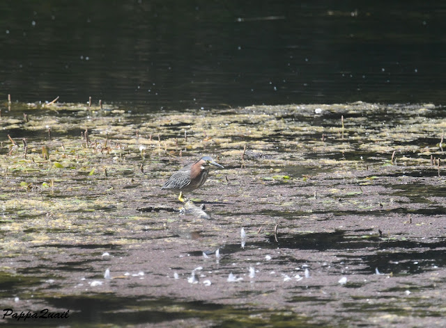 After giving due attention to the herons and egrets in the nesting colony on the tree, Pappa Quail pointed at the lagoon where he spotted a green heron. The heron was perched on a partially submerged piece of wood in the middle of the duckweed covered water and was difficult for me to see because it was camouflaged so well (no, it's not in the photo below but left of the frame).